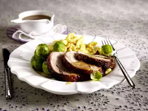 Braised Turkey Leg In Cider Sauce With Hazelnut Spaetzle And Brussels Sprouts