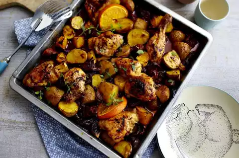 Spicy Chicken From The Tray With Chorizo And Potatoes