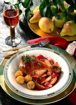 Leg Of Duck With Sweet And Sour Onion And Pear Vegetables