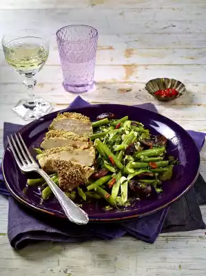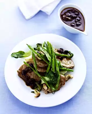 Fried Pork Tenderloin With Black Bean Sauce, Baby Pak-Choy, Green Beans And Cashew Nuts