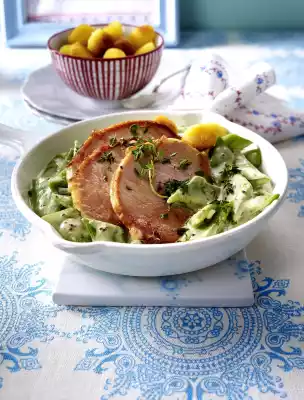 Sliced Pork Cutlet With Cutting Beans In Mustard Cream