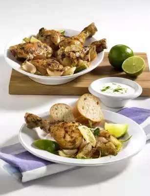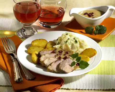 Chicken Souvlaki With Pomegranate Sauce And Mashed Potatoes And Garlic