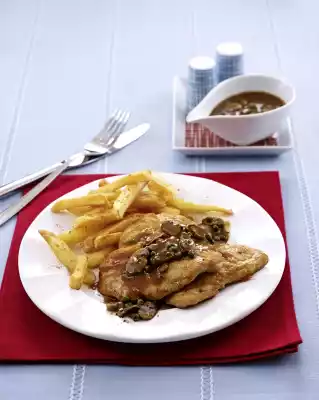 Turkey Schnitzel In Mushroom Sauce With French Fries