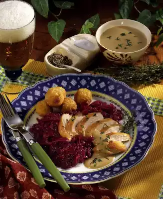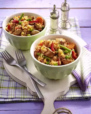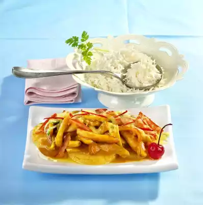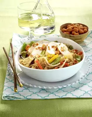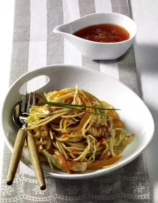 Wholemeal Spaghetti With White Cabbage, Turkey Filet, Paprika And Sweet-sour Sauce