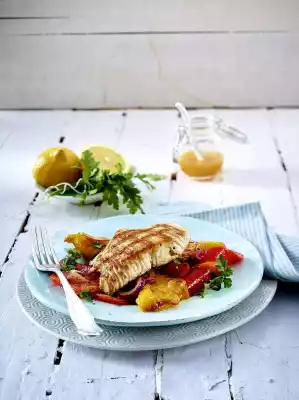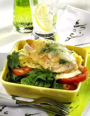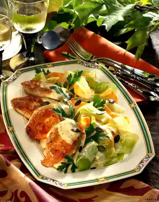 Fried Chicken Breast With Vegetables And Mustard Sauce