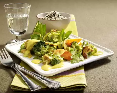 Chicken Cutlets With Broccoli And Carrots In Curry Sauce