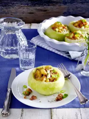Stuffed Zucchini With Mashed Potatoes, Chorizo, Chives And Gouda