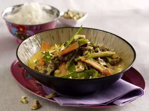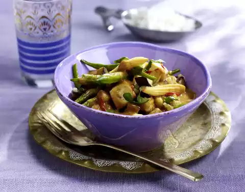 Thai Curry With Aubergines, Mini Corn On The Cob, Tofu And Green Beans In Coconut Sauce