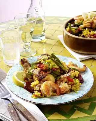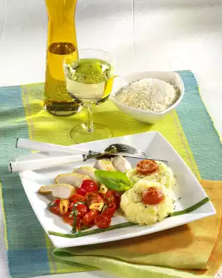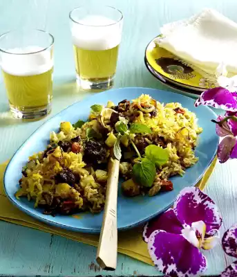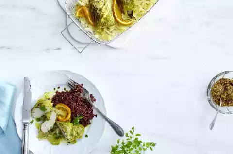 Poached Plaice Rolls With Pesto Filling On Coconut-curry Rice With Mangetouts And Peppers