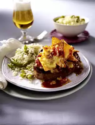 Steaks With Tomato Nacho Crust And Peperoni Rice