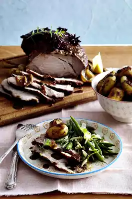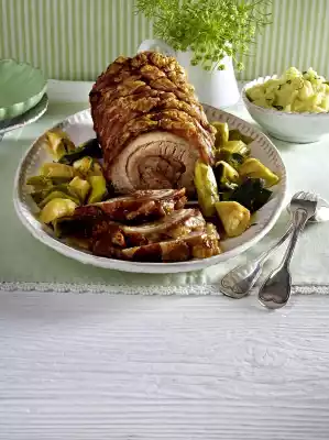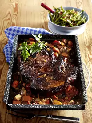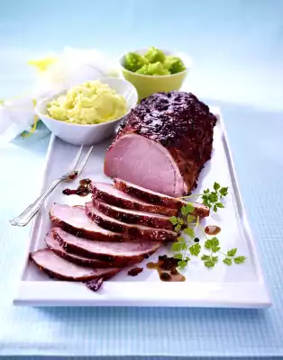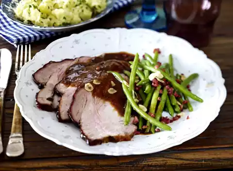 Schnitzel Roast With Plum Jam-cinnamon Glaze, Bacon Beans And Sour Cream Potatoes