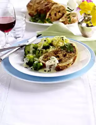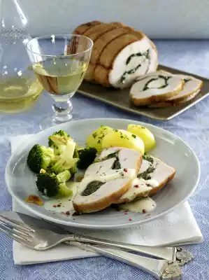 Roast Turkey Stuffed With Spinach And Gorgonzola In White Wine Sauce And Almond Broccoli