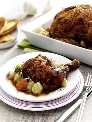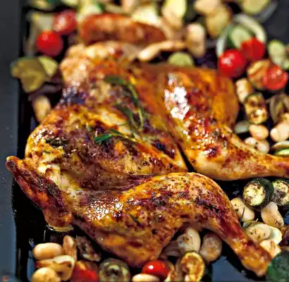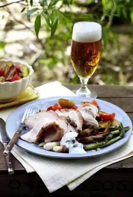Glazed Roast Ham With Tomatoes, Corn On The Cob And Shallots