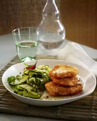 Chicken Nuggets In Coconut Breading With Spicy Cucumber Salad