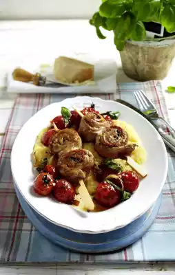 Schnitzel Roll Skewers With Polenta Mush And Braised Cherry Tomatoes
