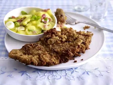 Veal Escalope With Roasted Onion And Mustard Seed Breading With Potato Salad