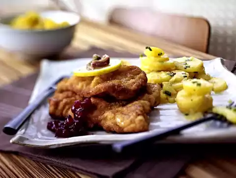 Schnitzel With Roasted Onion And Mustard Seed Breading And Potato Salad
