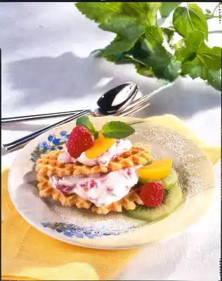 Waffle Burger With Raspberry Cream And Fruit Decoration