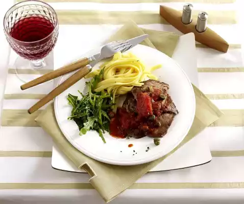 Beef Fillet Escalope In Spicy Tomato Sauce With Rocket And Ribbon Noodles
