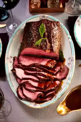 Roast Beef With Braised Balsamic Cherry Tomatoes And Roasted Polenta Cushions