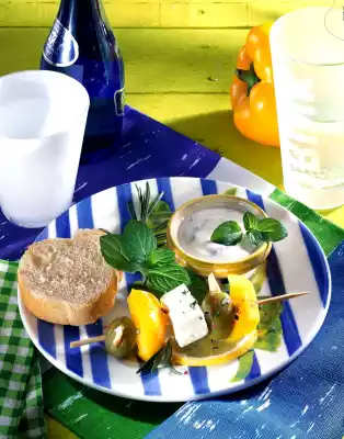 Colourful Feta Skewers With Mint Dip