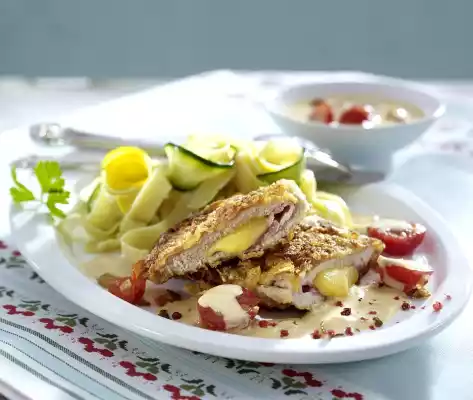 Cordon Bleu With Cornflake Crust With Zucchini Pasta And Tomato Sauce