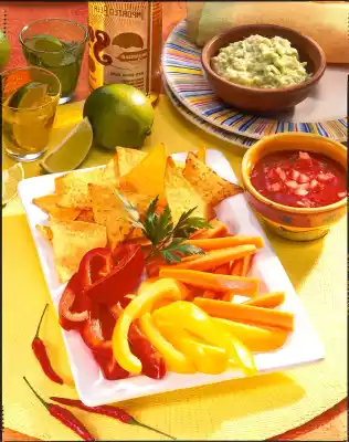 Nachos And Vegetables With Two Different Dips