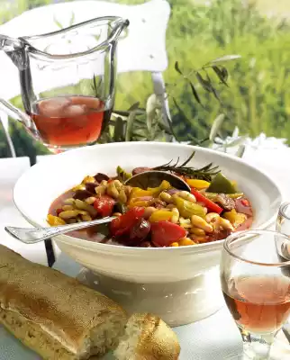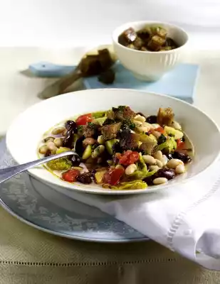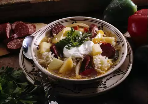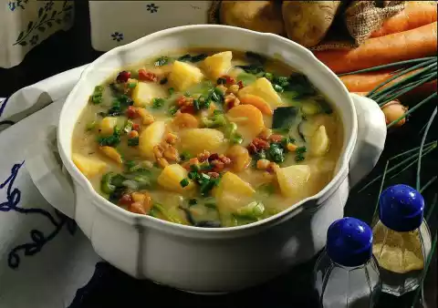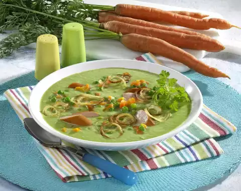 Creamy Pea Soup With Meat Sausage And Farmer's Bread Croutons