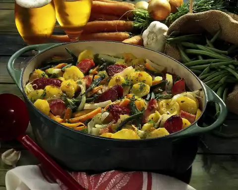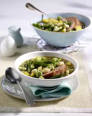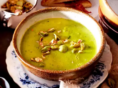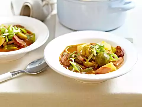 Sweet And Sour Lentil Soup With Pear Wedges And Fennel Salami