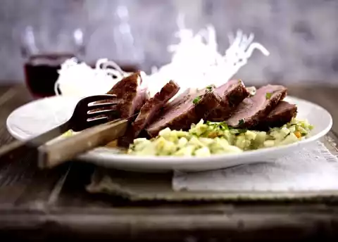 Duck Stuffed With Prawns On Ginger And White Cabbage