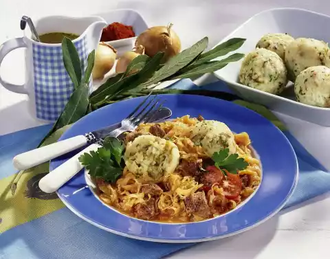 Roasted Onion Dumplings With Sauerkraut Minced Goulash