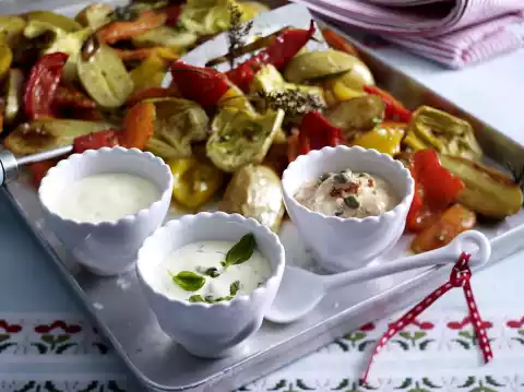 Triple Aioli With Baked Vegetables Made From Potato Wedges, Carrots, Peppers And Artichokes