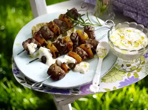 Grilled Rump Steak Apricot Skewer With Lemon Tahin Yoghurt