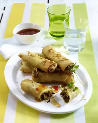 Spring Rolls With Glass Noodles, Mushrooms And Bamboo With Chili-chicken Sauce