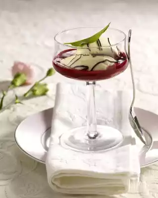Wine Mousse Cream Curls With Chocolate Strips On Raspberry Puree