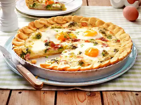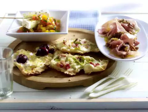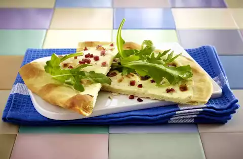 Tarte Flambée With Frosting, Diced Bacon And Rocket
