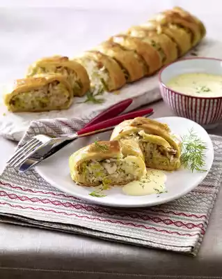 Puff Pastry Roll With Rice And Pointed Cabbage Filling And Hollandaise Sauce