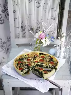 Spinach-Gorgonzola Quiche With Cherry Tomatoes And Pine Nuts