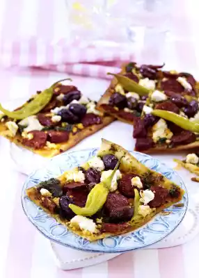 Summer Tarte Flambée With Goat's Cream Cheese, Chorizo, Pepperoni, Olives And Pesto
