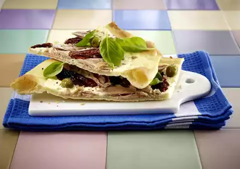 Tarte Flambée With Frosting, Dried Tomatoes, Olives, Tuna And Basil