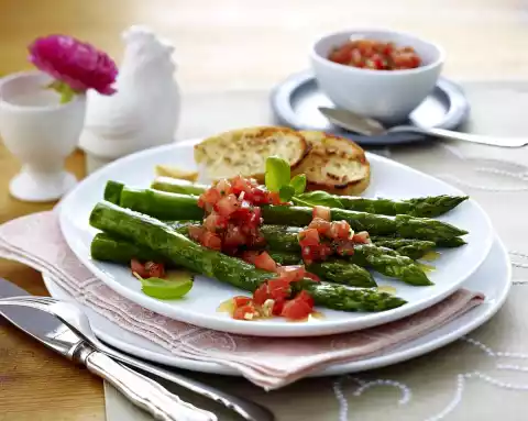 Roasted Green Asparagus In Balsamico Stock With Salsa Dip And Roasted Baguette