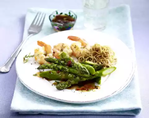 Green Asparagus With Sweet Chilli-soy Sauce With Scampi Skewers And Fried Noodles