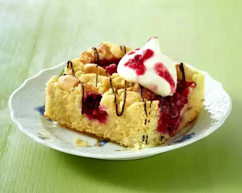 Yoghurt Semolina Cake From The Tray With Strawberries And Raspberries