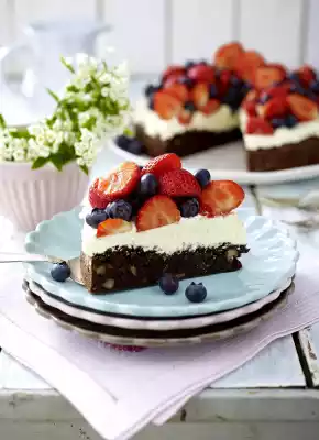 Brownie Walnut Cake With Strawberries And Blueberries