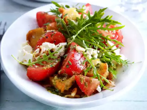 Macaroni Cake With Cherry Tomatoes, Rocket And Cabanossi In Cheese And Egg Milk