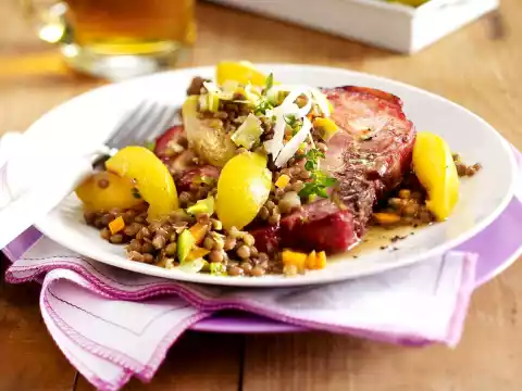 Kasseler Chops With Summer Plum-lentil Vegetables
