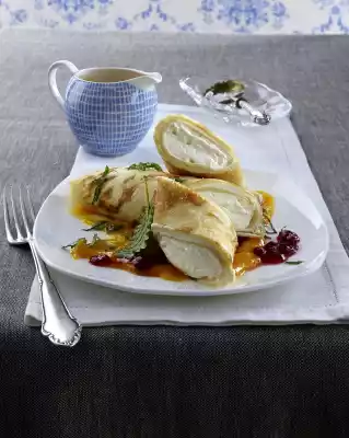 Pancake Rolls With Vanilla Curd On Mango Puree With Cranberries