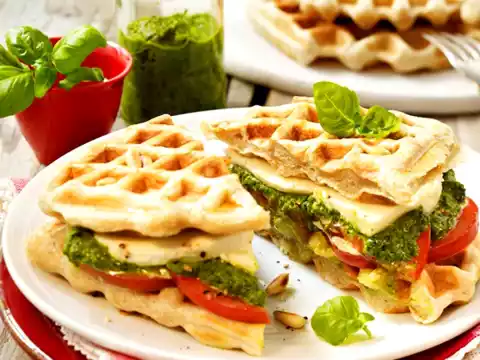Ciabatta Waffle Sandwiches With Pesto, Tomatoes And Mozzarella