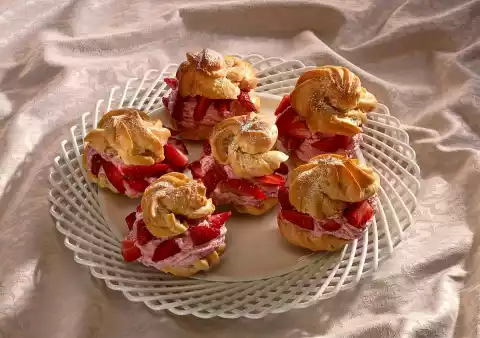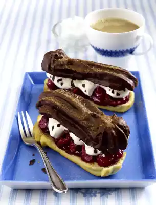 Eclairs With Cherry Compote, Stracciatella Cream And Chocolate Icing